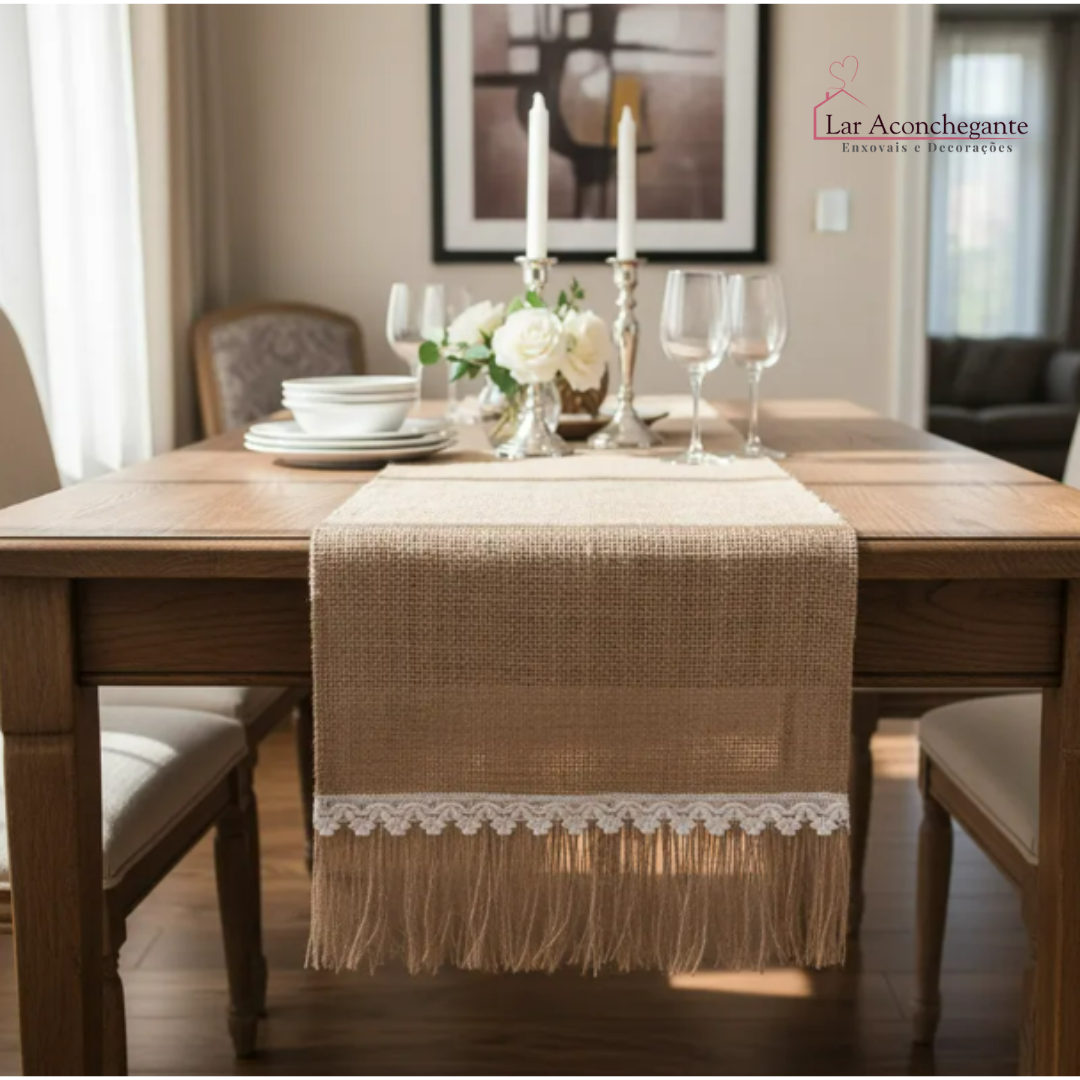 Design Natural: Com uma textura rústica e cores neutras, este caminho de mesa combina perfeitamente com decorações de estilo campestre, boho ou vintage;