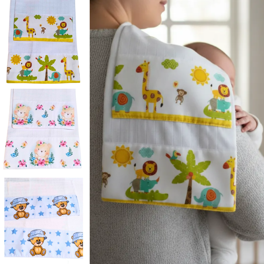 "Kit 2 Peças Fralda de Pano – Babete e Ombro | Estampa Digital com Barrado